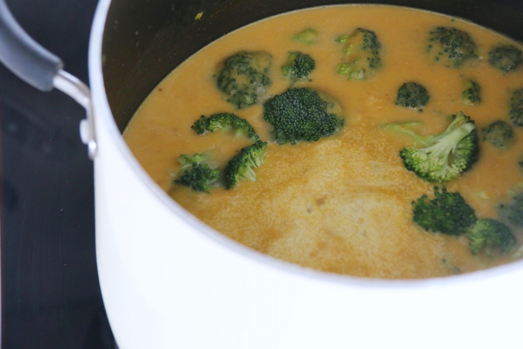 When the pumpkin is soft add around half of the soup in the blender and mix until its completely creamy. Return the soup to the pot and add now peanut butter, soy sauce and coconut milk. Put the broccoli in and cook for about 10 minutes until the broccoli is soft. Then add your pepper rings.